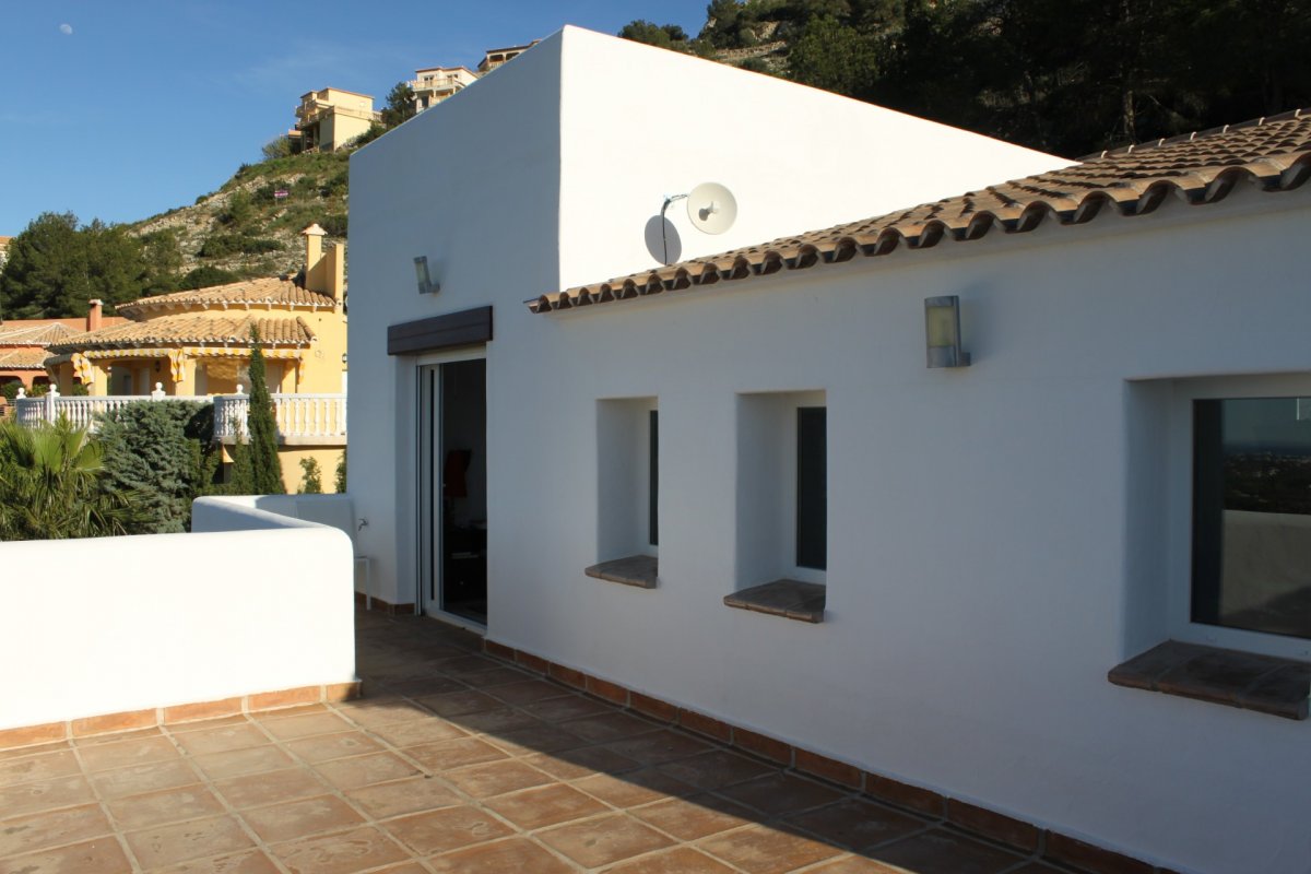 Preciosa villa de estilo ibicenco en la ladera oeste del Residencial La Sella Golf, Denia. Totalmente reformada en 2014 con piscina infinita disfruta de vistas excepcionales de la costa mediterránea y de la sierra de Segària con sus espectaculares puestas de sol.