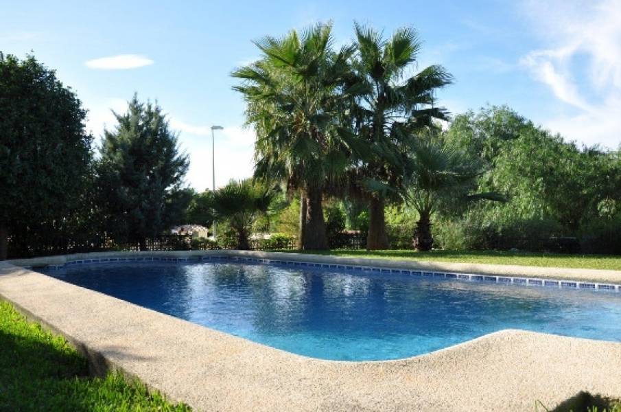 Esta villa en venta en Dénia tiene calefacción por suelo radiante y esta propiedad también tiene una gran piscina con escaleras romanas en un jardín mediterráneo con palmeras y árboles frutales y amplia plaza de aparcamiento dentro de la parcela.